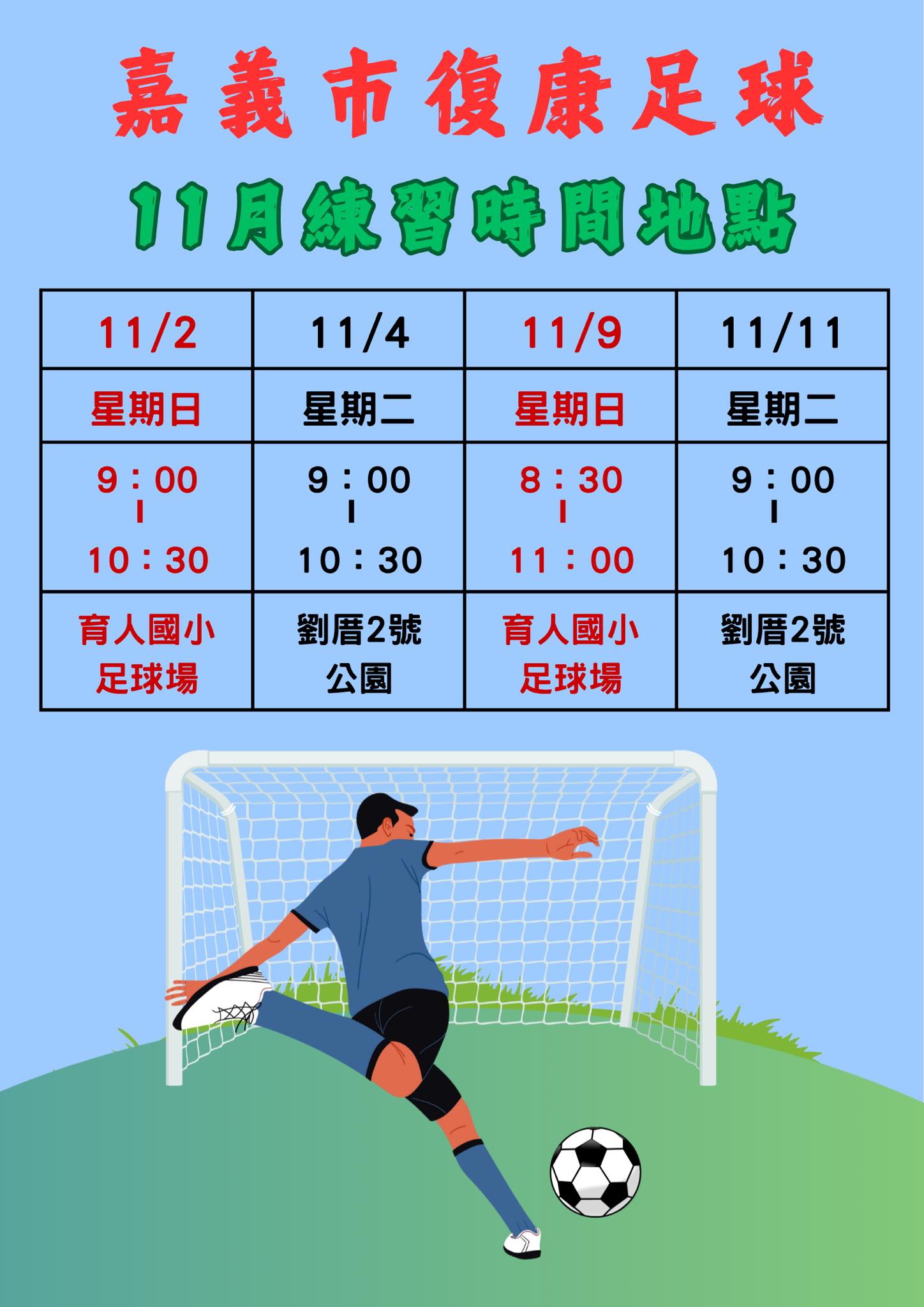 嘉義市復康足球 11月練習時間公告