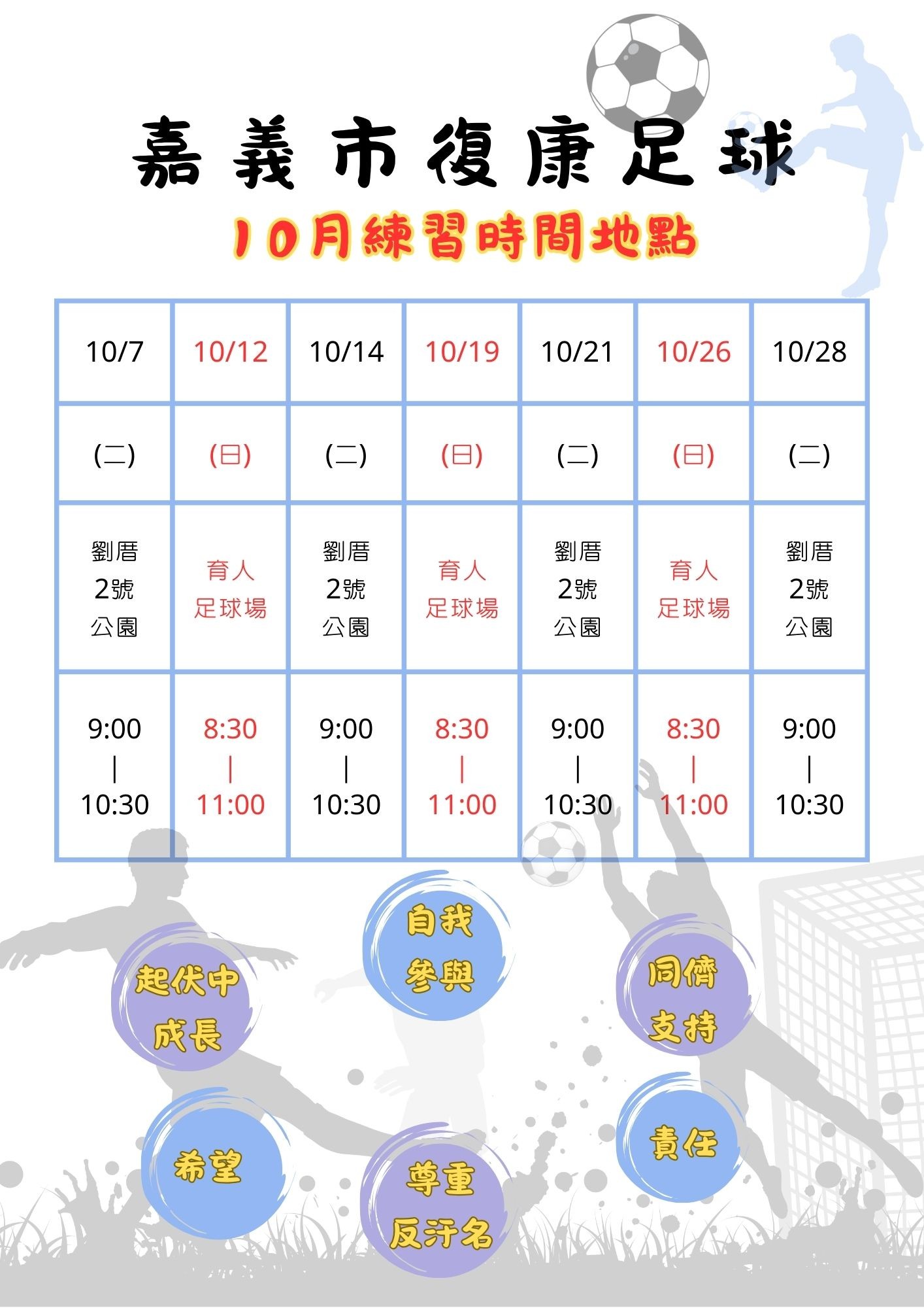 嘉義市復康足球 10月練習時間公告