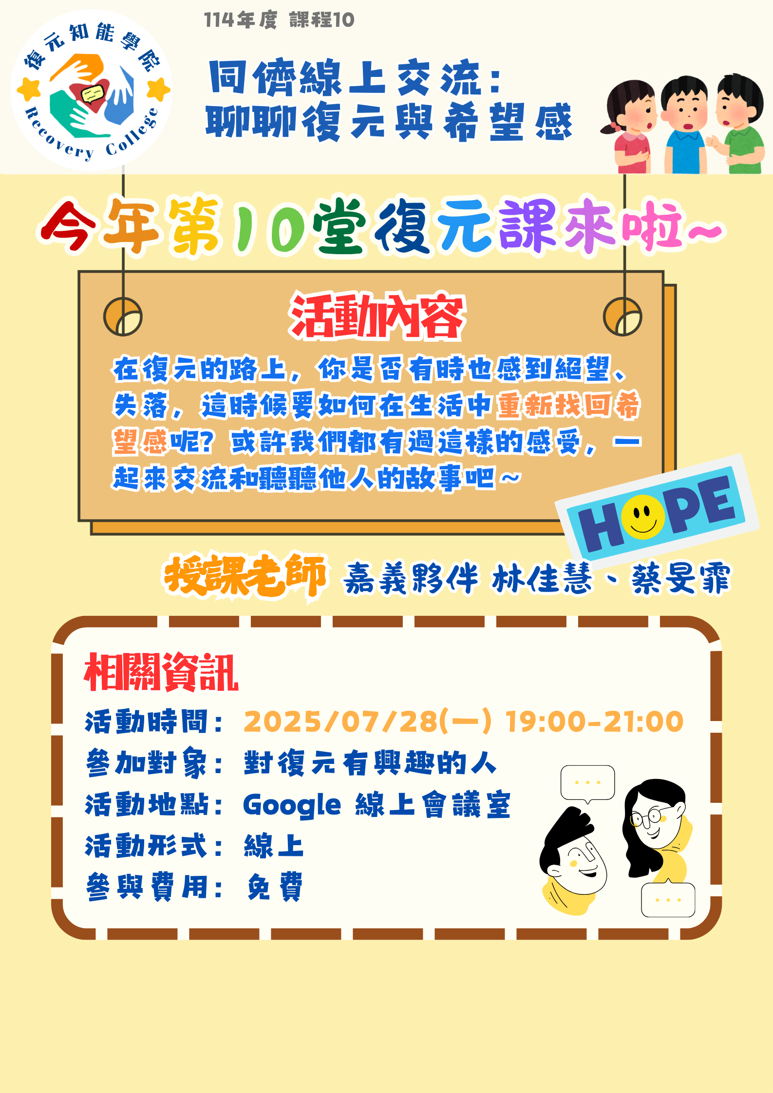 【同儕線上交流:聊聊復元與希望感】